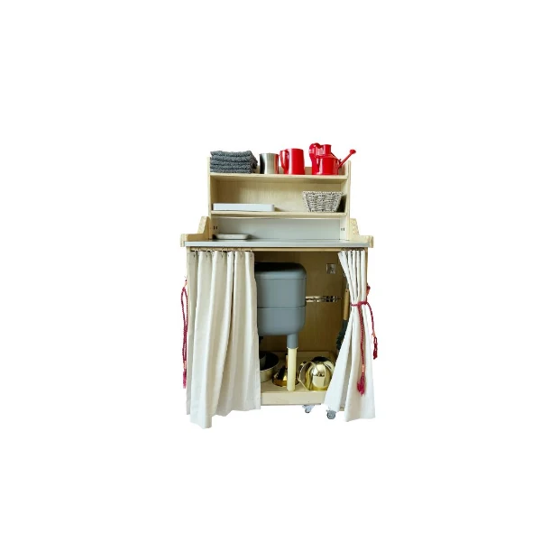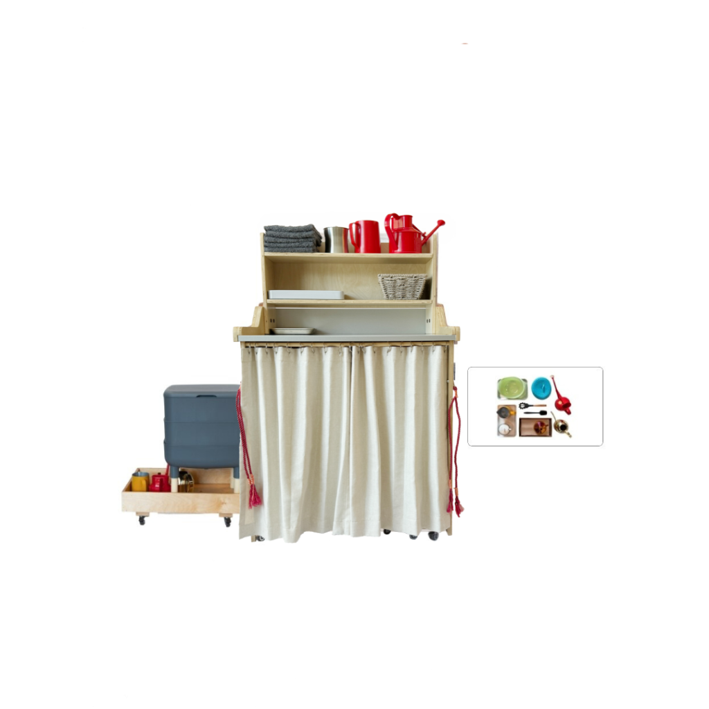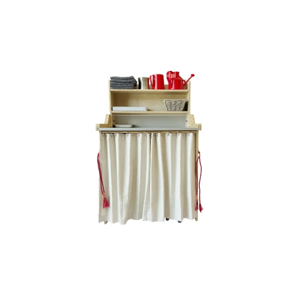 An inviting cabinet for child and the composting worms. Children adore the worms and this cabinet will help you maintain them within your prepared environment. The worms can be brought to a work area by the child with the wheeled trolley and or tucked away by using the curtains to put the “worms to bed”.